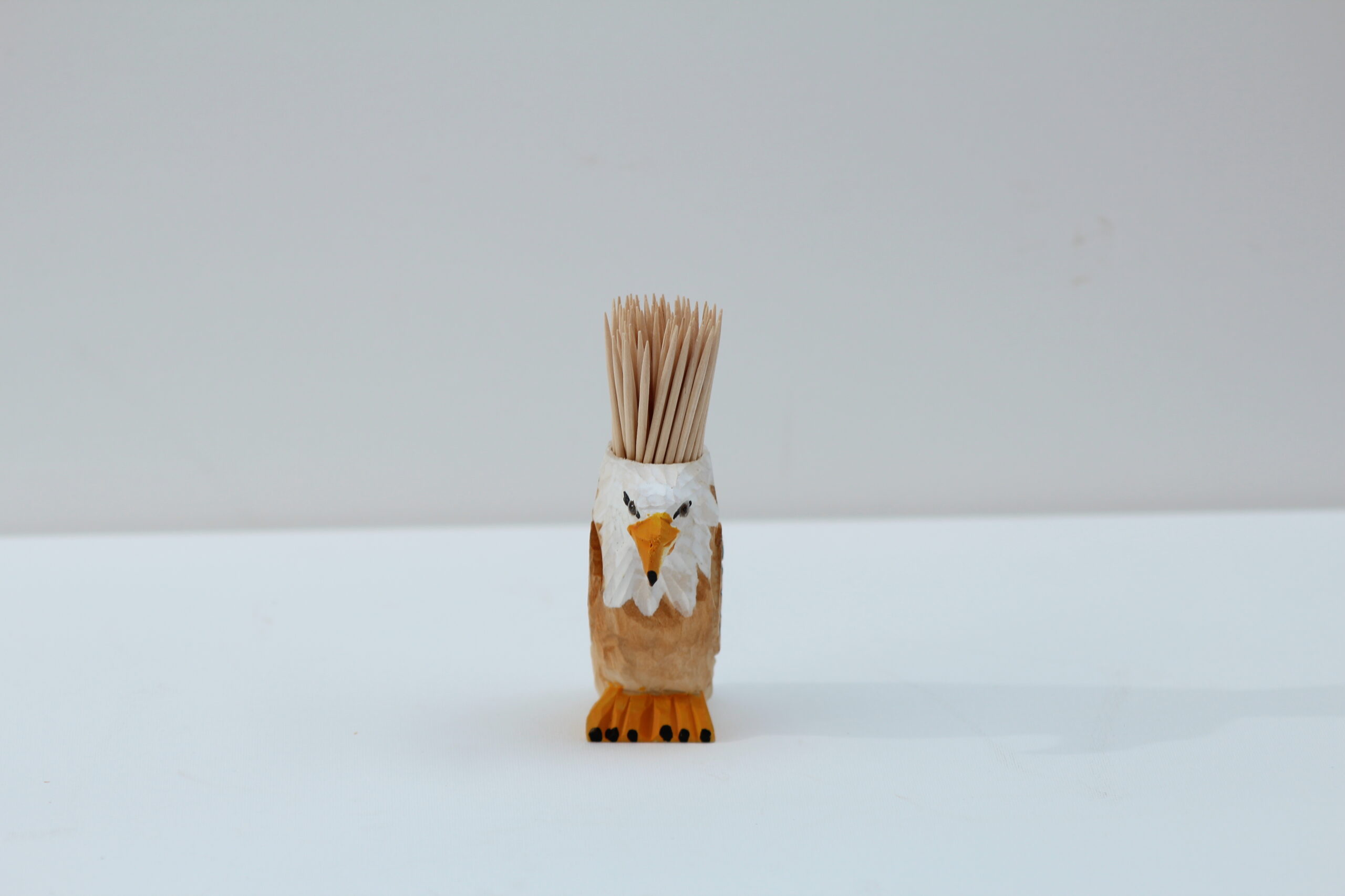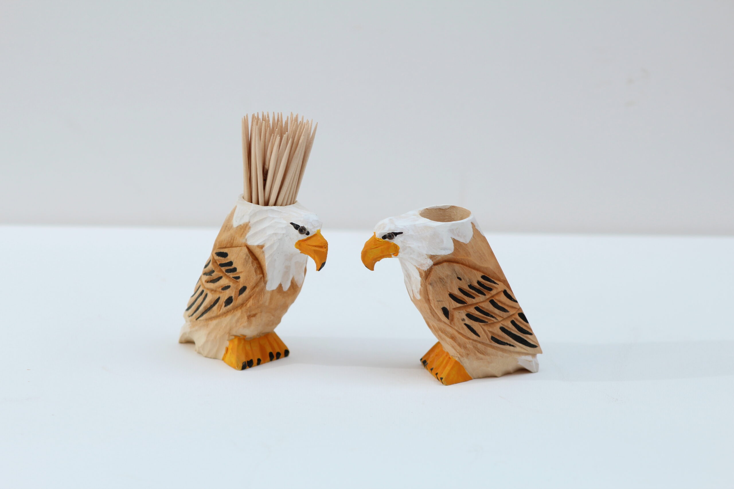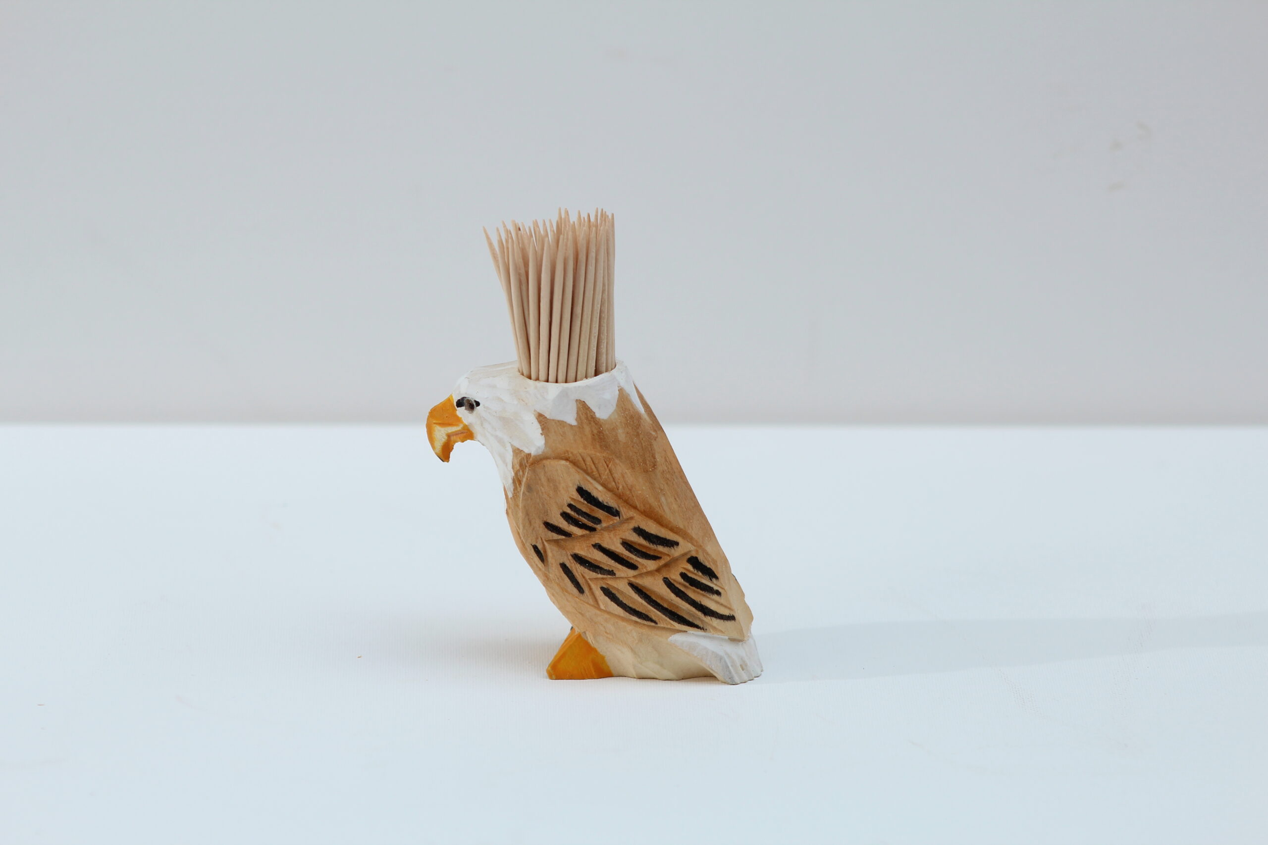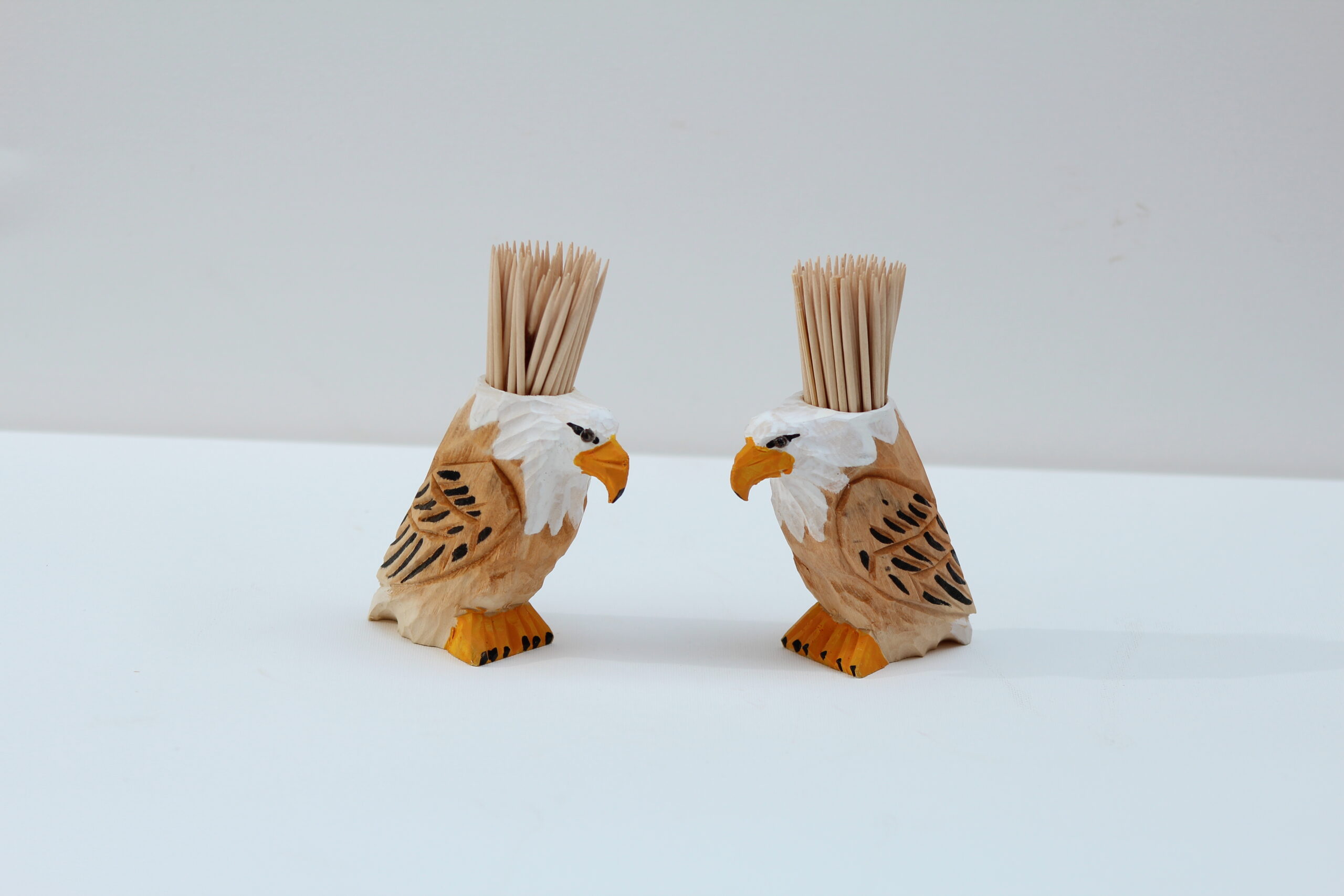Der handgeschnitzte und handbemalte Zahnstocherbehälter aus Lindenholz ist mit seiner Adlerform ein