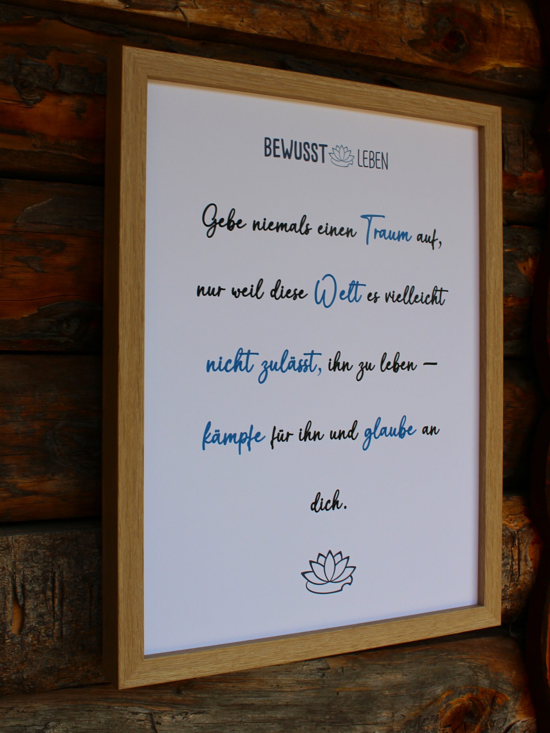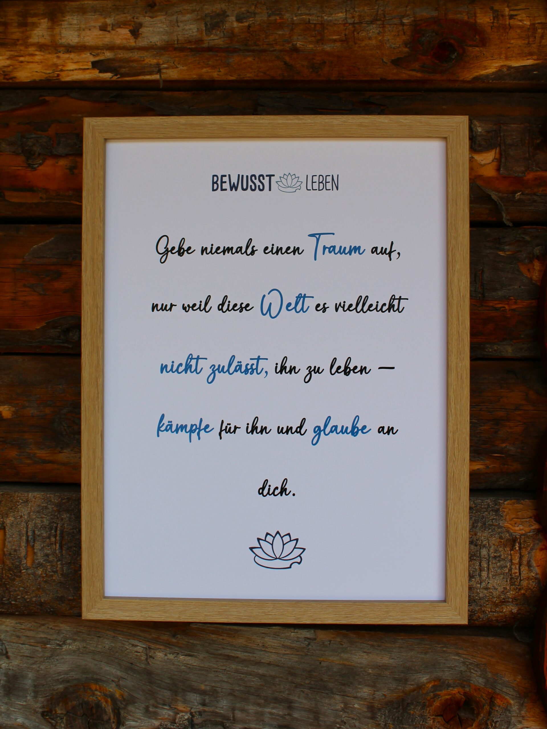 Wenn an deiner Wand noch etwas fehlt, dann ist dieses Poster genau das Richtige. Nachdenkende Sprüche in einem einfachen Design bringen eine zeitlose und ruhige Atmosphäre in dein Zimmer. Falls dein Alltag mal wieder stärker ist und dir deinen Fokus auf deine Träume und auf dein Leben nimmt, dann gibt dir das Poster wieder Kraft und Hoffnung zurück.