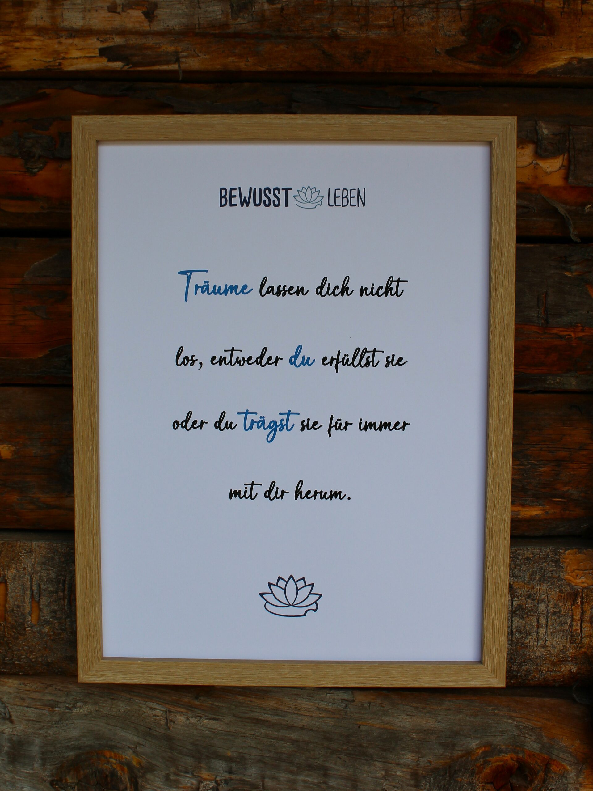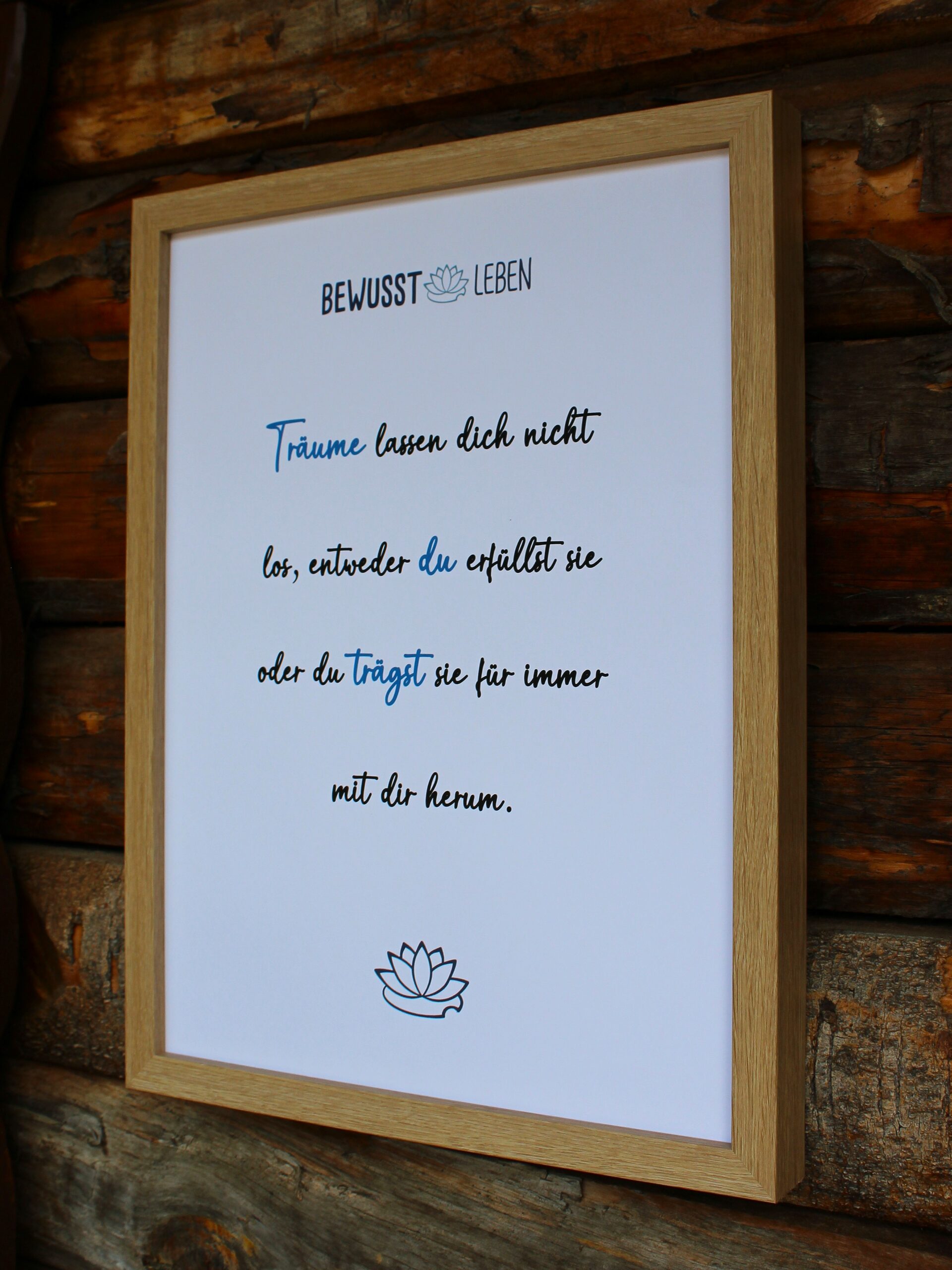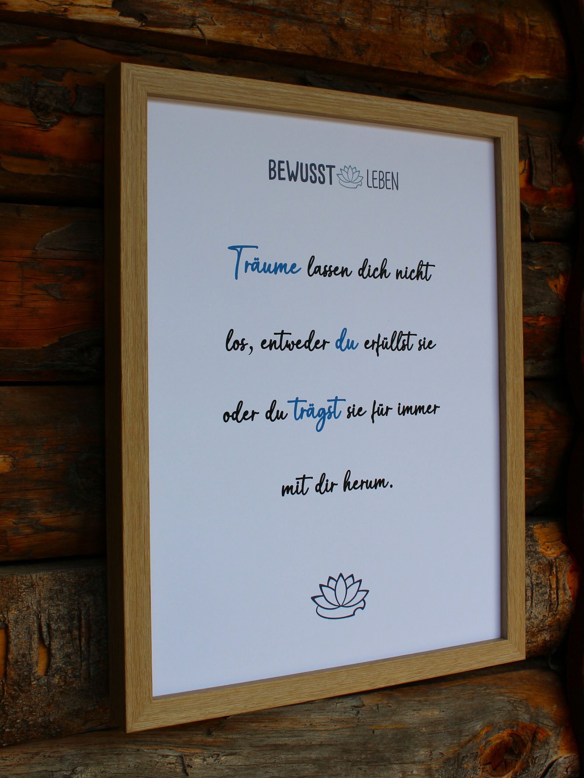 Wenn an deiner Wand noch etwas fehlt, dann ist dieses Poster genau das Richtige. Nachdenkende Sprüche in einem einfachen Design bringen eine zeitlose und ruhige Atmosphäre in dein Zimmer. Falls dein Alltag mal wieder stärker ist und dir deinen Fokus auf deine Träume und auf dein Leben nimmt, dann gibt dir das Poster wieder Kraft und Hoffnung zurück.
